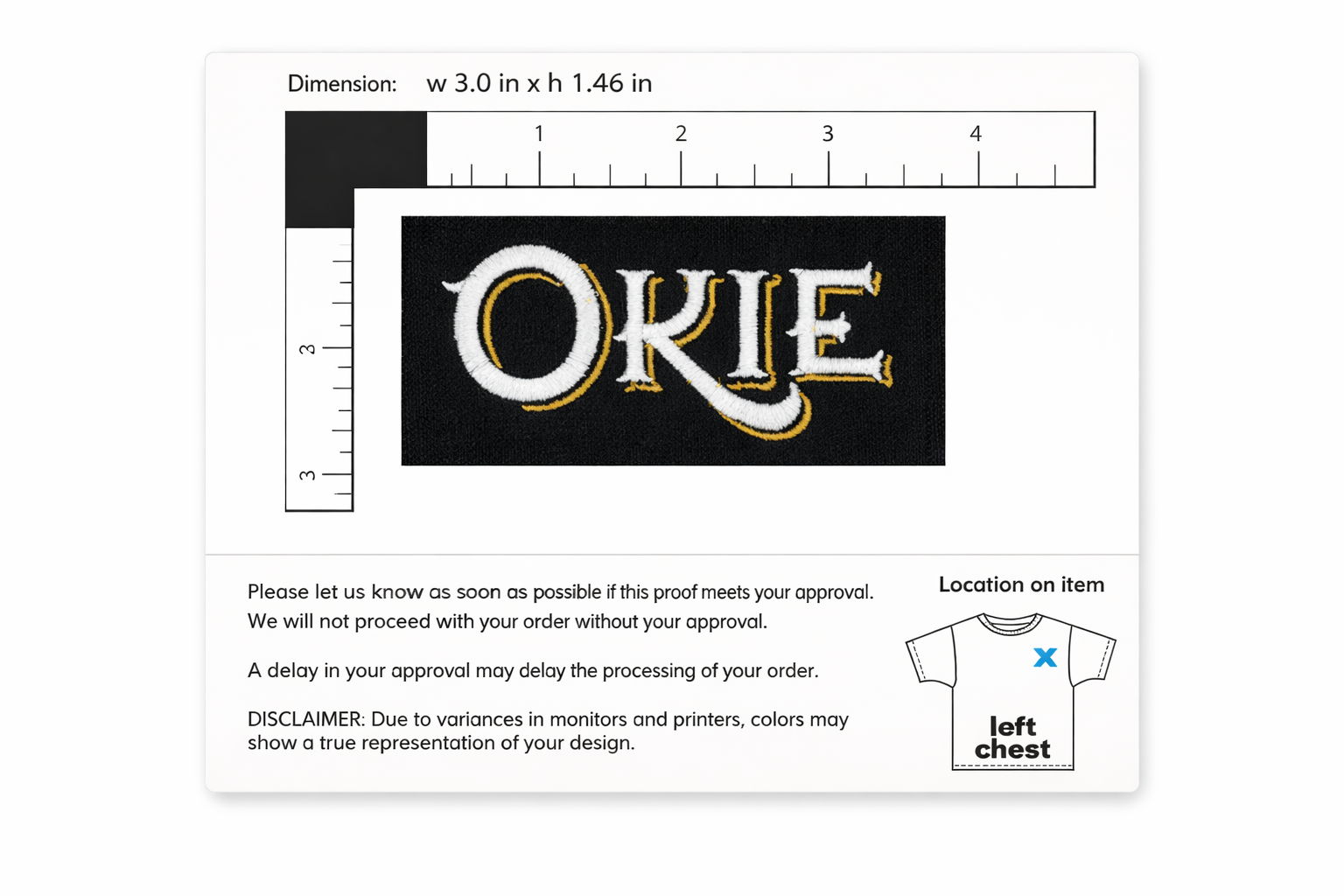 Within 3-4 business days after you place your custom order you will receive an email with a proof of your real sewn-out logo. It is important that you respond promptly, any delay in responding may delay your order. We will not start producing your order until you approve your proof.