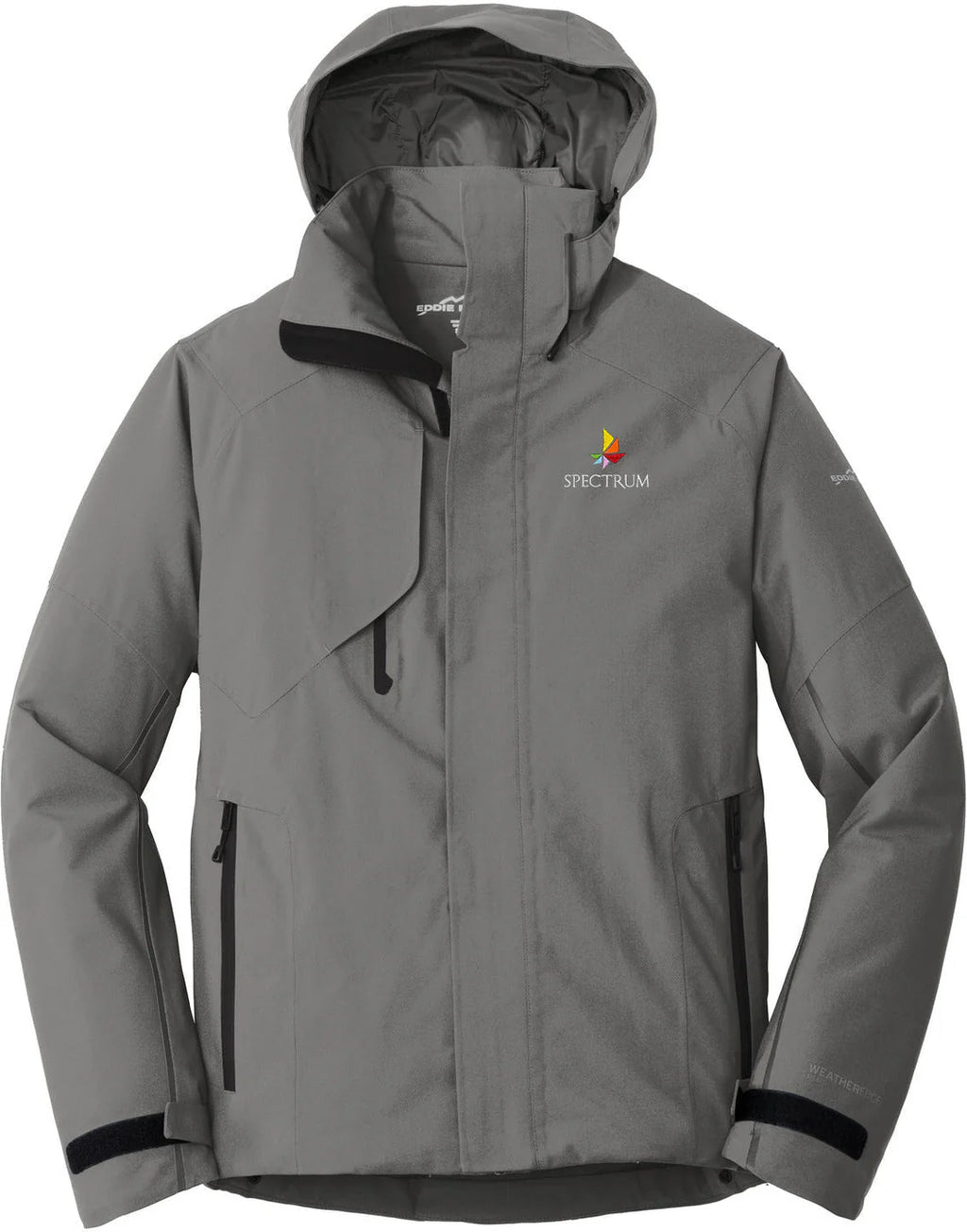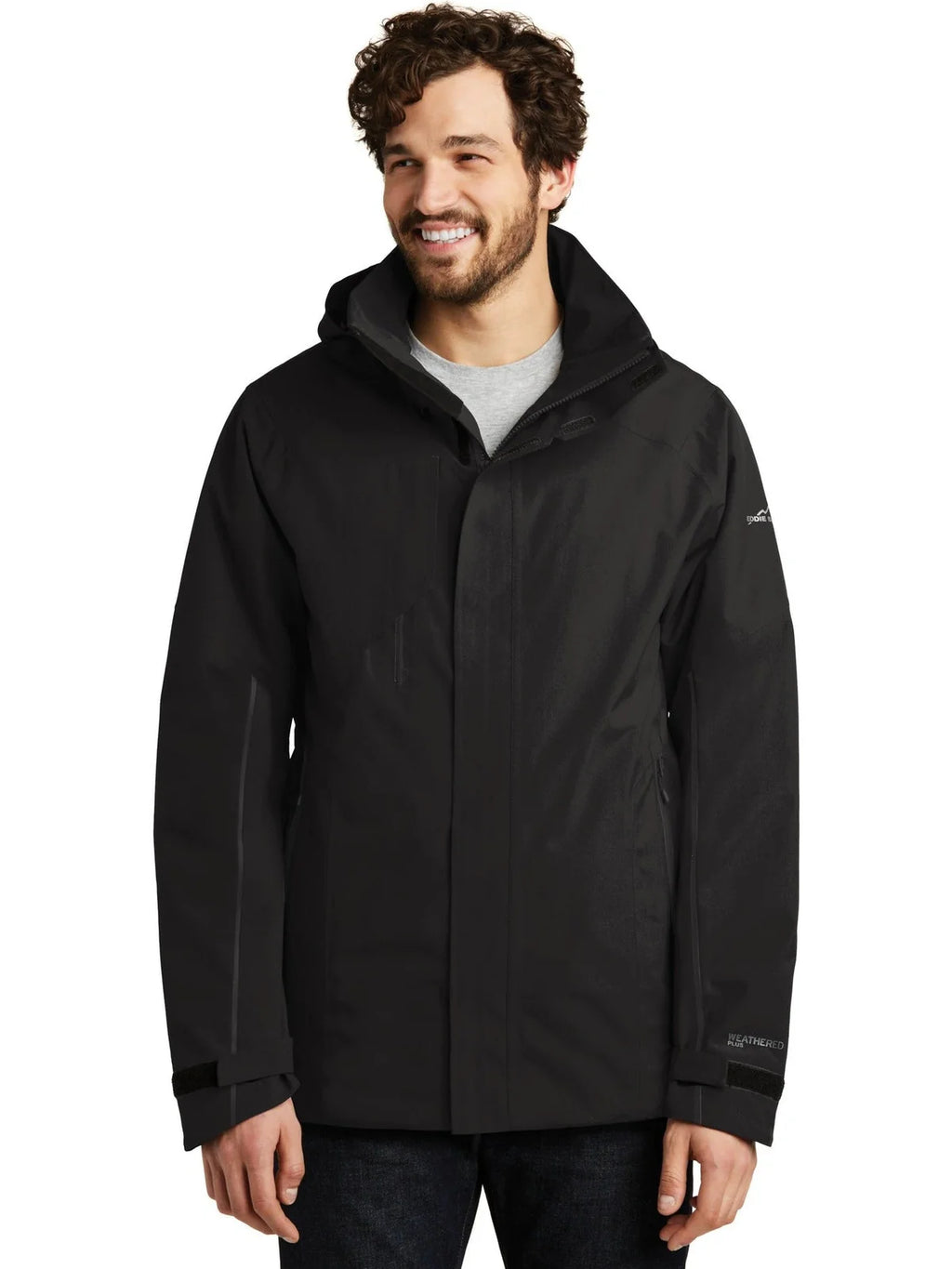 - Contrast heat transfer Eddie Bauer and WeatherEdge Plus logos on left sleeve