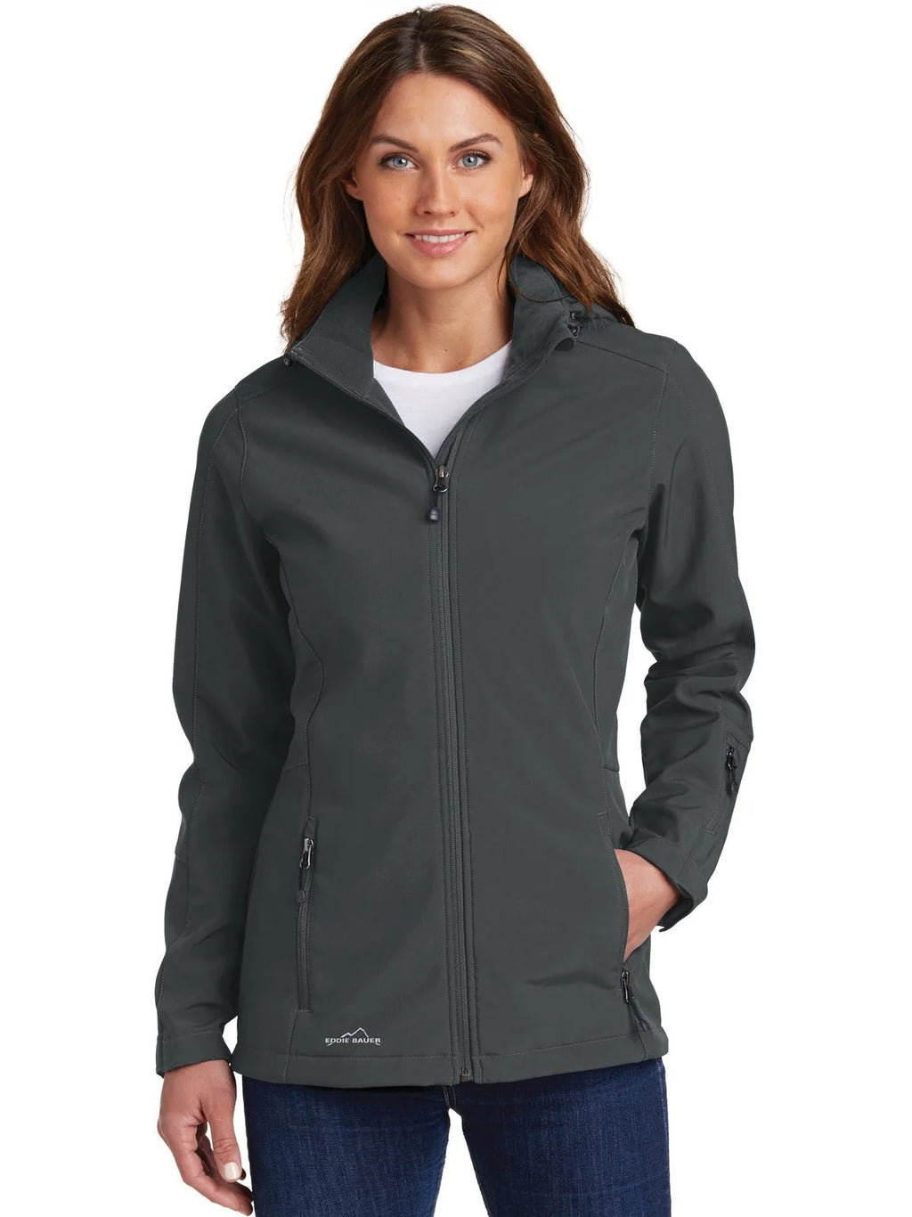 - Contrast heat transfer Eddie Bauer logo on right hem