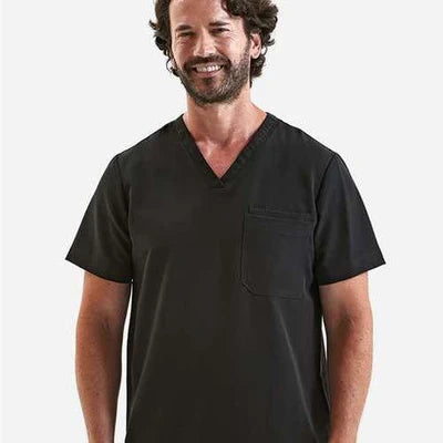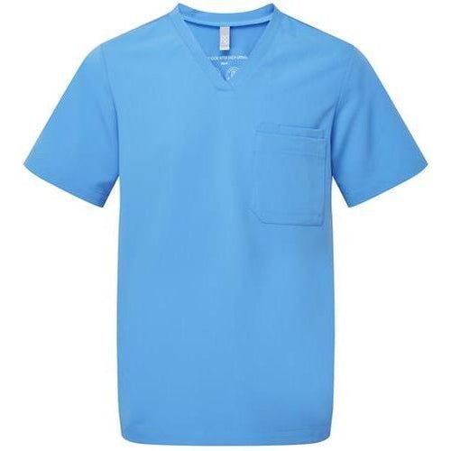 - V-neck style with left chest pocket with combined mobile and pen pocket