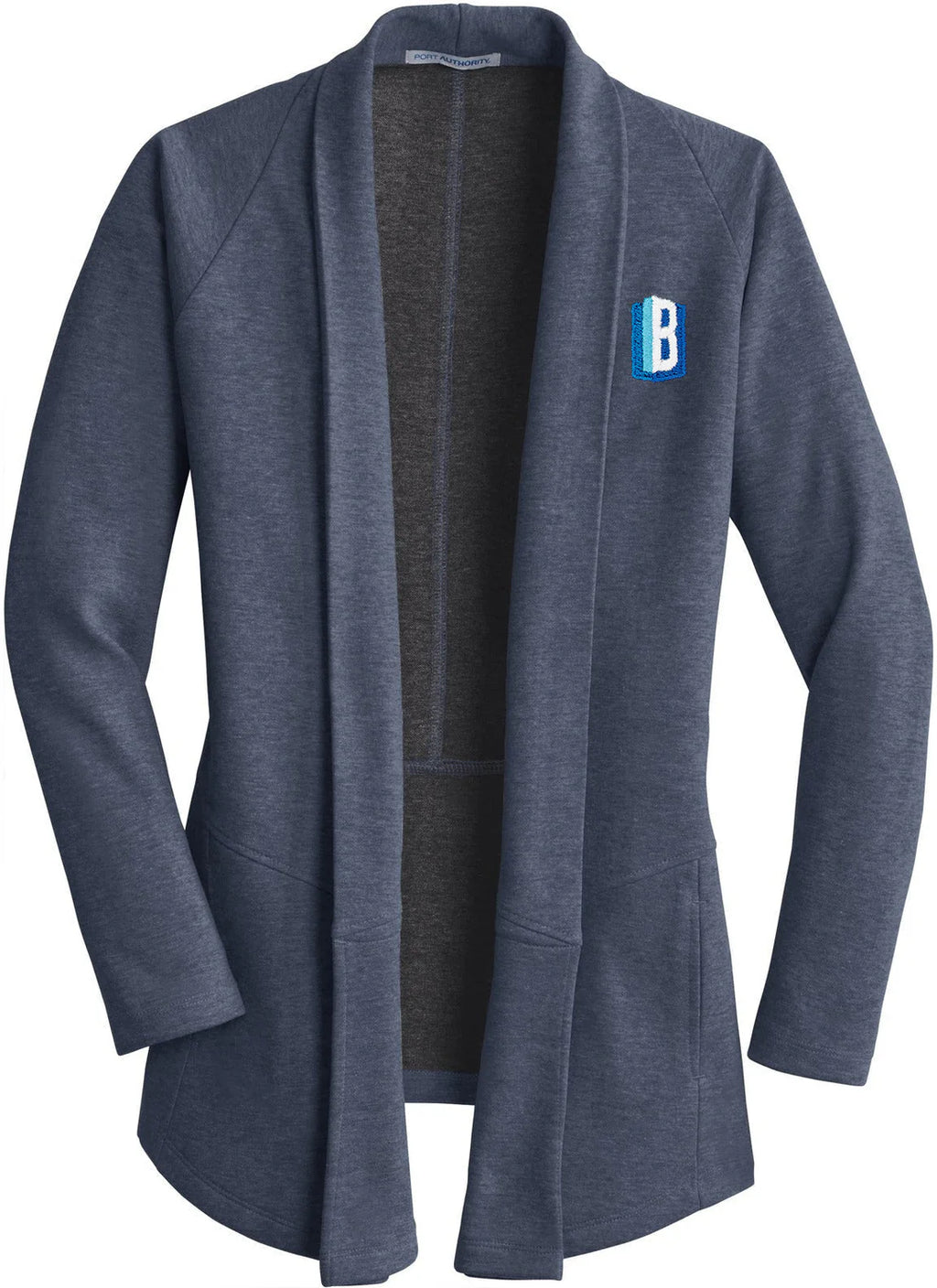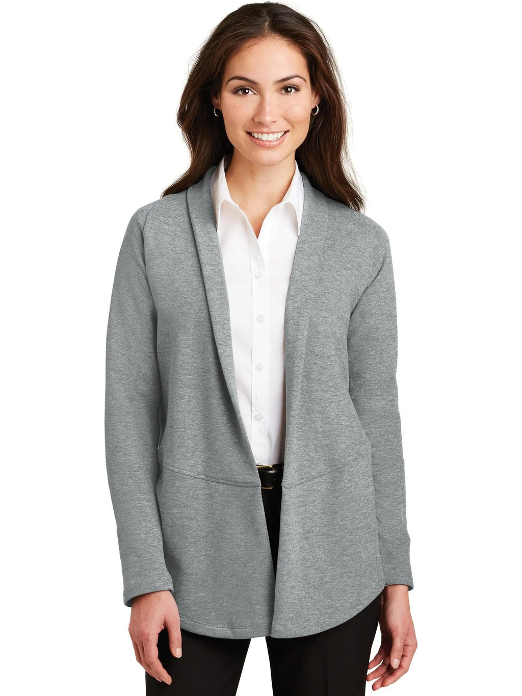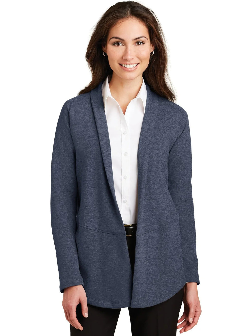 This lightweight, dual-color cardigan layers beautifully and has a timeless appeal. An open front and front and back seaming details at the waist give it sophistication.